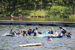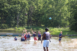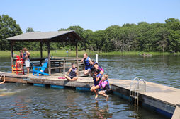 Welcome to Lake Maranatha, just down the hill from the cabin road! Our expansive U-shaped dock marks the swimming area, perfect for a refreshing dip. Campers can indulge in fishing, explore the lake with our canoes and paddleboards or visit the Snack Shack. The beach area offers plenty of fun, featuring Adirondack chairs, a shaded cabana, and a dock for fishing or crafting, along with sand volleyball and seasonal activities like a water trampoline and a mini-blob. Come and make unforgettable memories with us!